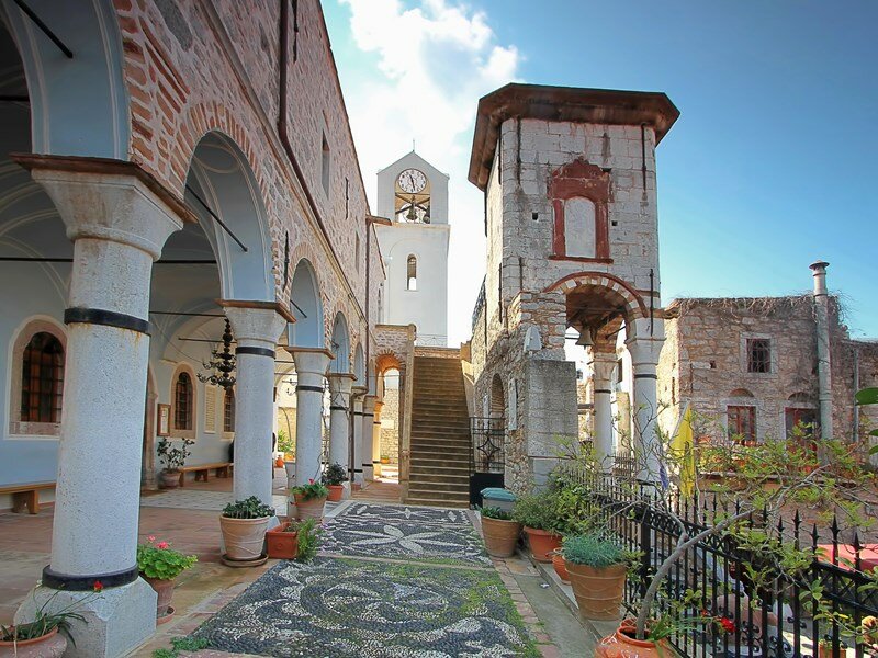 The church outside has a two-way double staircase on the top of which the bell-tower rises. The big bell-tower is very recent. Both the staircase and the bell-tower are made of stone from Thymiana, a village near the capital where a special kind of stone is produced. Later, when the steps showed signs of wear they were replaces by new ones made of local stone. the stairs lead to the churchyard, which is composed by remarkable patterns made of black and white pebbles. Pebbly yards are very typical of the architecture of Chios. On the right side of the courtyard the stairs lead to a place set apart for women. In the narthex a remain of the tower can be noticed: it is the cistern for water , fountana as it is called in Mesta.